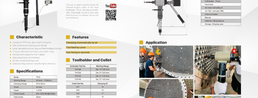 TF40 được sử dụng để xử lý nhanh các ống có chiều dài khác nhau của bộ trao đổi nhiệt. Việc kẹp không khí tự động, cấu trúc chiều dài cố định, cấu trúc cấp liệu kiểu đòn bẩy, có thể cải thiện đáng kể hiệu quả công việc.